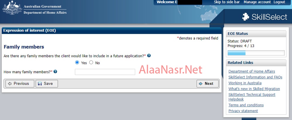 هتختار اذا كان فى حد من اسرتك هيكون معاك فى الهجرة ولا لأ (زوجة\زوج\اطفال) ، و تكتب عددهم ، لو مافيش حد معاك فى الهجرة هتختار