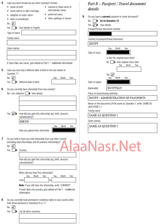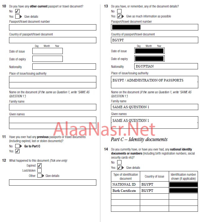 الصفحة التانية معلومات عن الباسبور على اليمين ، و على الشمال الإجابات هتكون زى الصورة لو ماعندكش جنسية تانية غير بلدك أو اقامة دايمة فى بلد تانية