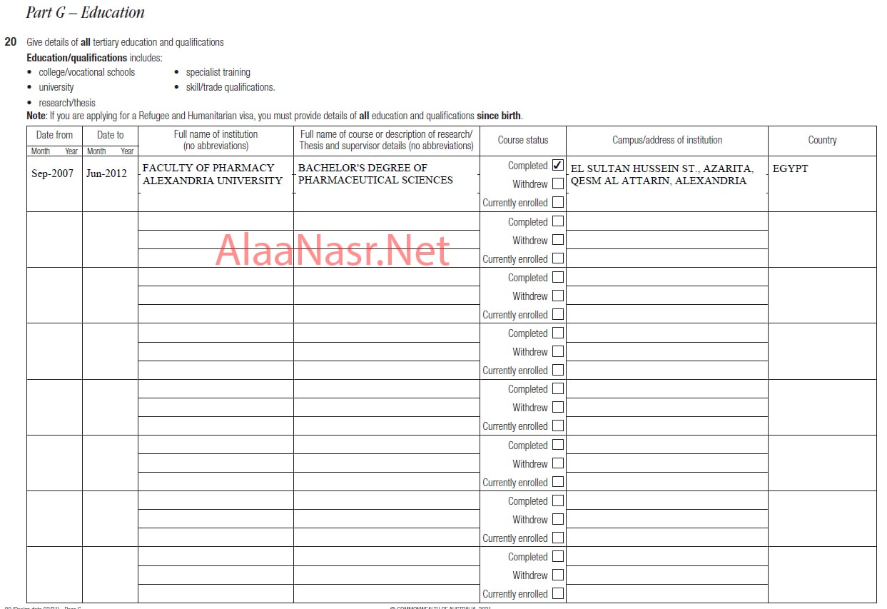 الصفحة رقم 6 معلومات عن الدراسة ، اضغط على الصورة علشان تشوفها بحجمها الطبيعى ، فى الغالب كلنا كصيادلة هنكون متشابهين بردو فى الجزء دا ، لو درست ماجيستير أو دكتوراه اكتبها