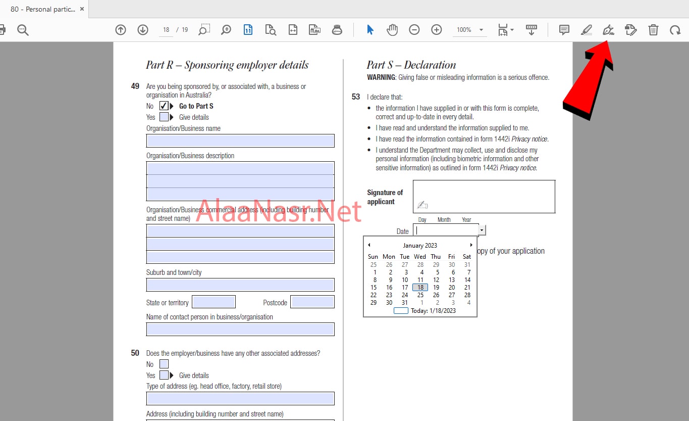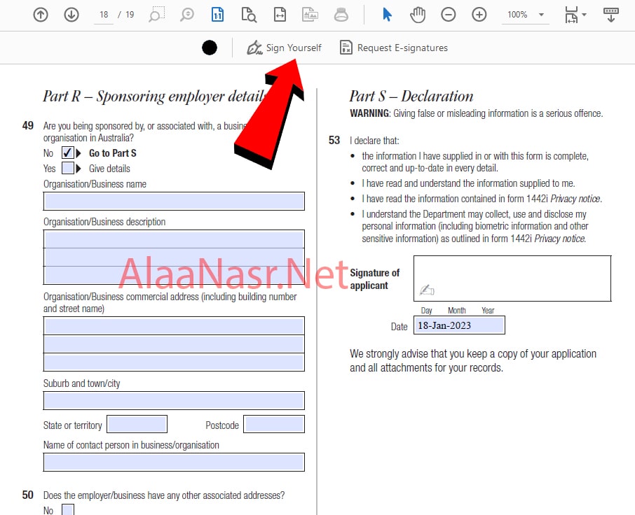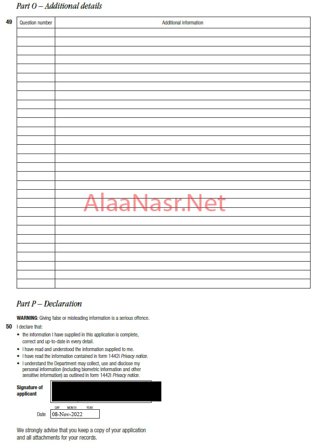 و ارجع للصفحة اللى فاتت ، اكتب التاريخ و امضيها ، أنا مضيتها يوم رفع الأوراق للفيزا علشان يكون تاريخ الإمضاء جديد