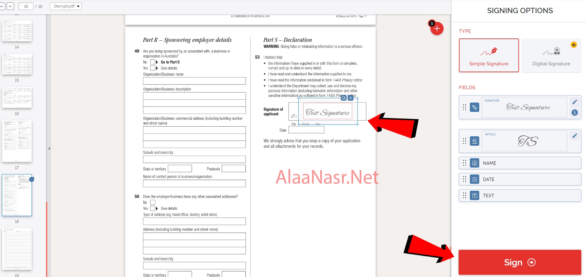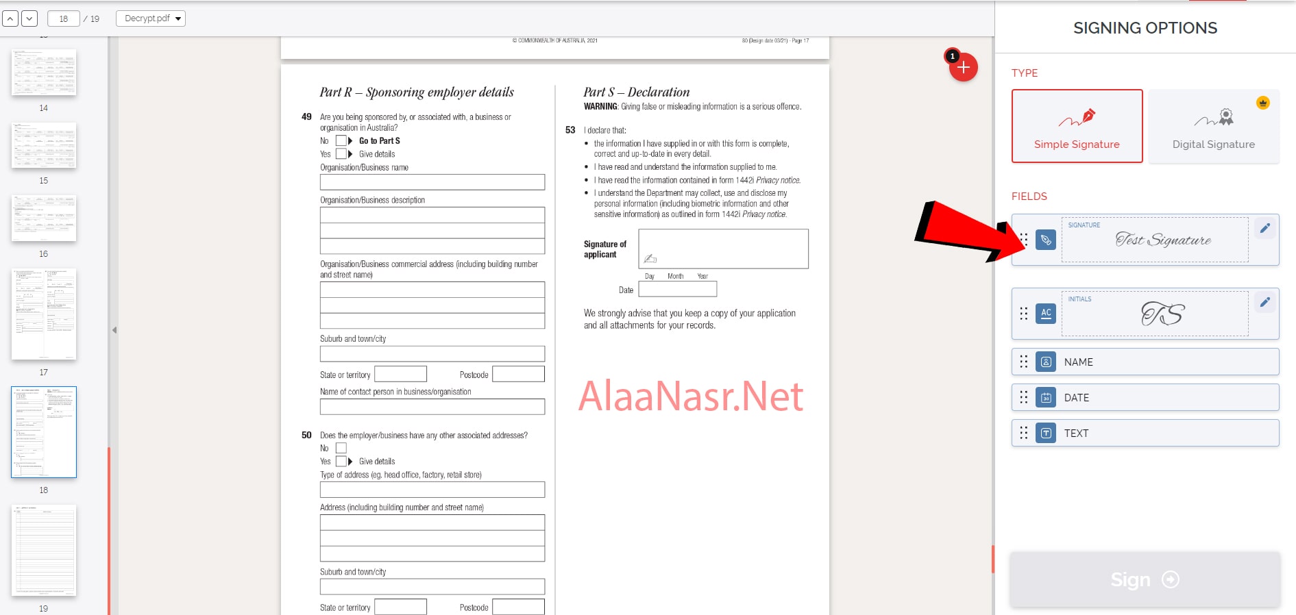 انزل فى الملف للصفحة اللى فيها التوقيع و طبعا زى ماقولنا تكون مكمل الملف كله (و يكون عندك منه نسخة زيادة علشان لو حبيت تغير حاجة ) و تختار التاريخ ، و تسحب التوقيع من على اليمين للمربع بتاع التوقيع