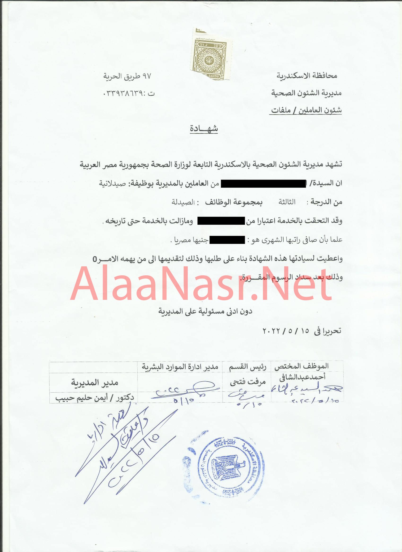 شهادة خبرة من مديرية الشئون الصحية