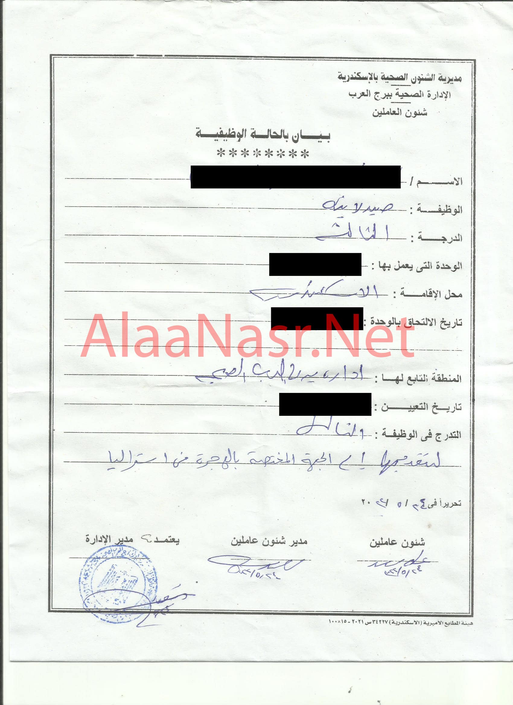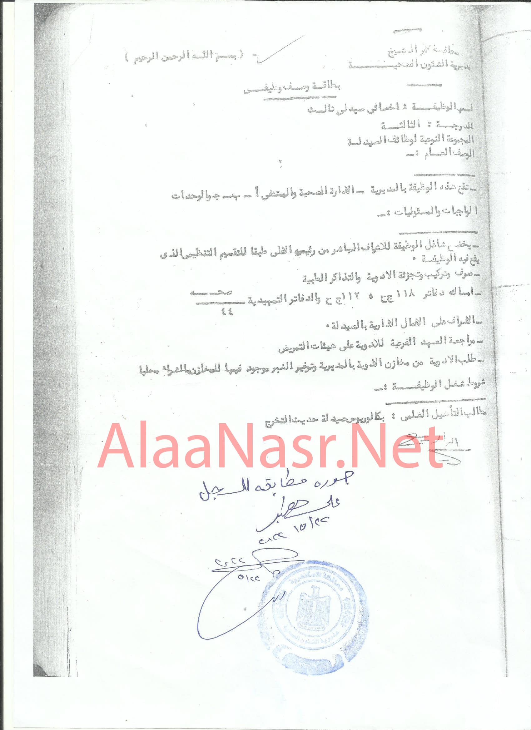 بطاقة وصف وظيفى من مديرية الشئون الصحية