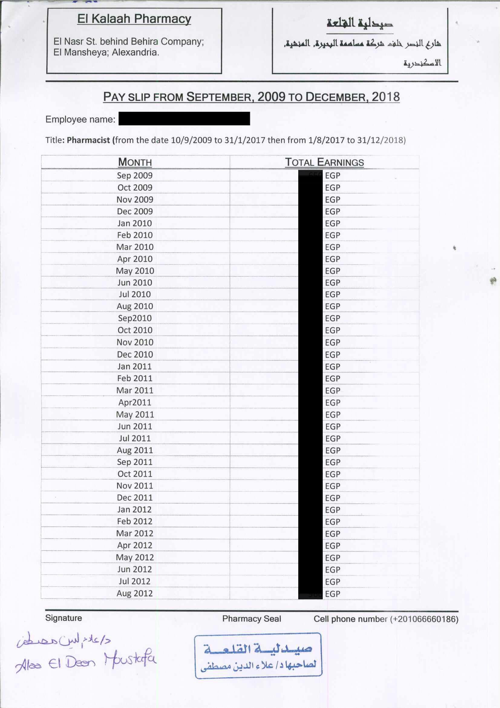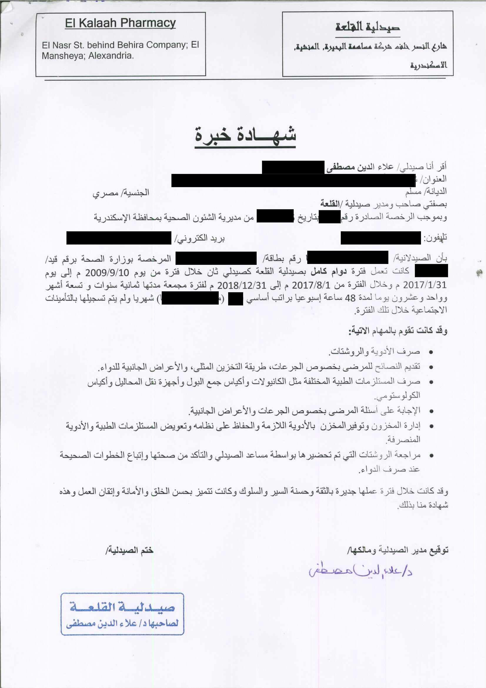 من الصيدلية أو الصيدليات اللى اشتغلت فيها (لو تقدر توثقها فى الشهر العقارى يبقى خطوة زيادة و افضل طبعا ، لو ماقدرتش فى زملاء اتقبلت منهم من غير توثيق من الشهر العقارى)